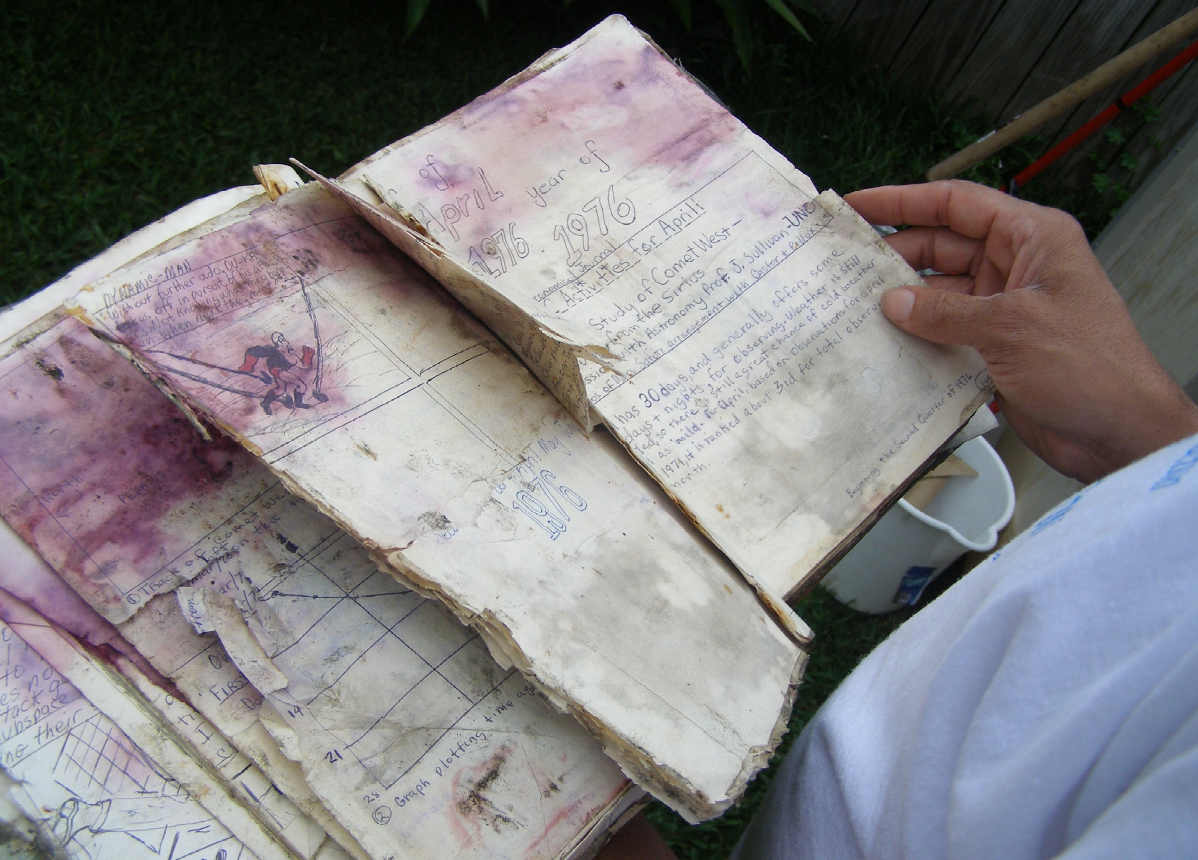 THE VEGA OBSERVATORY ASTRONOMICAL JOURNALS RESTORATION - A WORK IN PROGRESS A Historical Preservation Project Performed by: Gary Barabino In the two photos above, Gary Barabino (the author of the VAO Astronomical Journals) looks over the Hurricane Katrina damaged 1976 volume of the journal in disbelief prior to restoration. The ongoing efforts on Gary's part to restore the journals will undoubtedly preserve the most important segment of the VSC's history. This has been the most important project concerning the Vega Sky Center since post Hurricane Katrina. The restoration of the VAO Astronomical Journals began back in the spring of 2007, and has continued since. As of this writing I have restored 21 volumes (1970 through 1991) of the 34 editions that were completed at the close of 2004.The first six (1970-1975) were made of the larger sizes (11" x 14") as the restoration began and had to be reduced to standard note binder size (8.5" x11") that started with the 1976 volume. During this work each journal is meticulously broken into 12 monthly sections- January to December. The sections start with "Planetary Configurations", which is a daily event log of solar system object, moon phases etc., and is headed by "Date of Event" (DATE), "Time of Event" (TIME in Universal Time) and addition to the Event itself. Another section entitled "Key Astronomical Events" highlights major astronomical events for a month, such as an eclipse, planetary opposition, or elongation. Next is the "SkyLog" section, which is my written record of VSC related activities. Following this is the "Telescopic Observations" section, which portrays the monthly-recorded telescopic views of various celestial objects. Finally, I include a monthly sky map dated for mid month and solar system ephemeris courtesy of the program "Your Sky" for which the twelve monthly sections make up each volume. To enhance the preservation of the journals going forward, each of the pages within each volume have been placed in sheet protectors so that delicate historical observations can be protected. Each of these notebooks is a treasure trove of information, and I am always looking forward to getting to do the next one. My colleague and Webmaster Mel Dawson of Riverview FL, Director of the Sirius Observatory, is and has always been a major contributor to these Astronomical Journals. Mel has an outstanding Fork Mounted 10” f/5.6 Newtonian Reflector that he himself constructed and I was blessed to perform "first light" (the Lagoon Nebula) through it. I will be adding updates on the restoration program as it progresses. Gary "Bam" Barabino Sr.