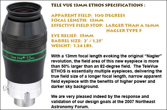 This was done because the objective cell, which is original to the telescope, is very slightly cone shaped, fitting tighter against the Flint Element as compared to the Crown Element. Saturn’s image had a strong streak protruding from it. I was very disappointed to say the least. Well, I decided to call it quits with the 90mm for the night and resolved to my 254mm (10”) Newtonian. I will check out the 90mm once I get back home to fix the issue. Curt was the first to train the 10” f/5.6 on an object that night. He selected one of his favorites, the galactic cluster M37. Curt used my inexpensive 25mm Series 500 eyepiece. He called me over to take a look and the view through the eyepiece was spectacular, regardless of the small FOV! The image of the cluster was sharp across the entire field. I had to take a second look at the shell of the eyepiece to make certain it was a Series 500! The observing session continued, with folks doing imaging and observational astronomy. The main event of the night to come was the shootout between Carlos Solis’ Stellarvue SV 102 ED, and Bob’s William Optics Megrez 110 ED Semi-APO refractors. But, before the event, it was time for the Big Surprise. As I was carousing around the FOO site to meet new members, I heard calls from Kevin and Curt asking me to come over and check out something they were looking at through my 10”. The first thing I noticed right away was the large ocular hanging off the end of my JMI Crayford focuser. Bringing my eye up to the eyepiece I noticed that it was quite huge and I begin questioning the group that hovered around my scope. Before I could finish my inquiry, the guys yelled out telling me to just take a look at what that had pointed at. So I did. As I slowly yet determinedly drew closer to the eye lens of the ocular, I began to see a multitude of stars at the center. It was the open galactic cluster M37 in the constellation Auriga, one of my favorites. Then as I peered outward away from the center of the cluster, I noticed that I could not find the edge of the field. I then shifted my head to the right looking for the field edge and continued to see hundreds of stars through my 10” f/5.6. By the time I found the field edge, I was nearly facing inline with the side of the tube! It was at that moment I realized I was looking through the premiere of eyepieces produced by TeleVue – the 100° degree AFOV 13mm Ethos! I uttered with haste the infamous words Gary Barabino and I express so eloquently, “Look at that!” Specifications for the New TeleVue 12mm 100-degree AFOV Eyepiece