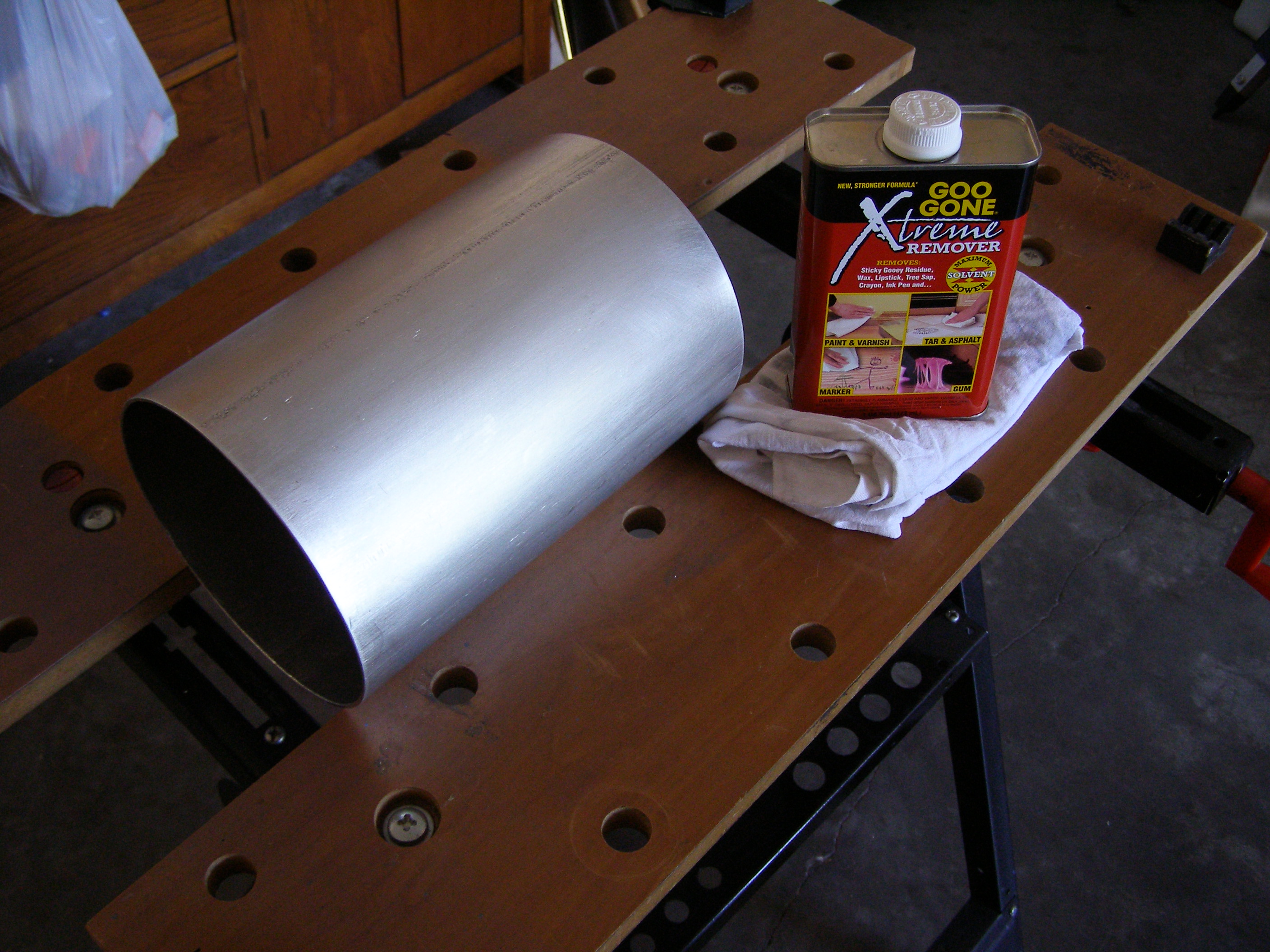 As with the main tube, the dew shield was sanded with 220-grit sand paper and buff with a Scotch-BriteŽ scrubbing pad in preparation for priming and painting. But before priming and painting, I thoroughly cleaned the dew shield inside and out with a white cotton rage drizzled with GooGone XtremeŽ remover. Looks great as compared to it before appearance. The dimensions of the dew shield are 6" OD x 9" L x .083" wall thickness, for which I purchased from the same place as the main tube - Hastings Irrigation Pipe Company.