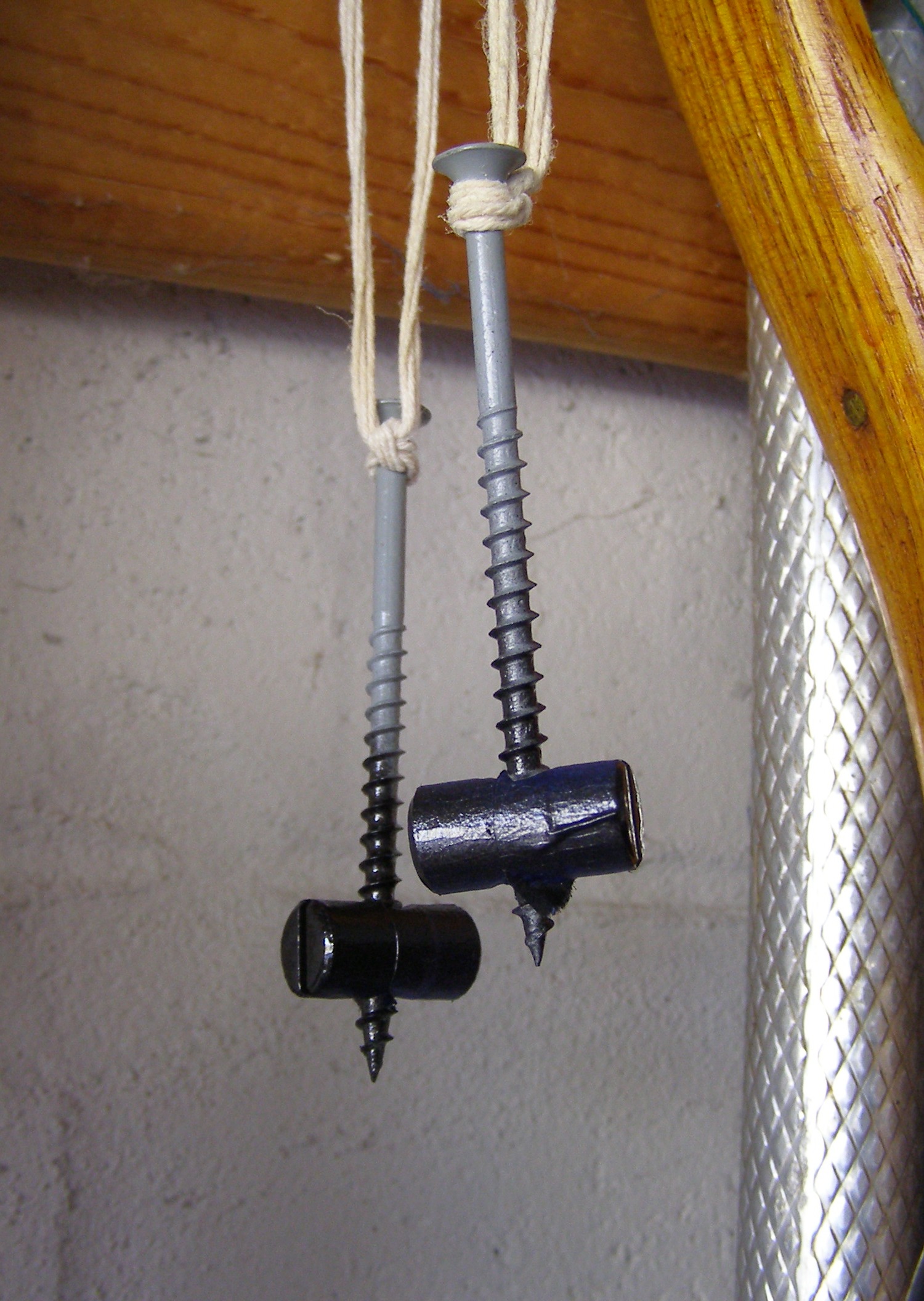 Hanging from string with their faces painted as they dry and cure are a couple of dowel nuts used for the cradle rings. The painter's tape was removed after 24 hours.