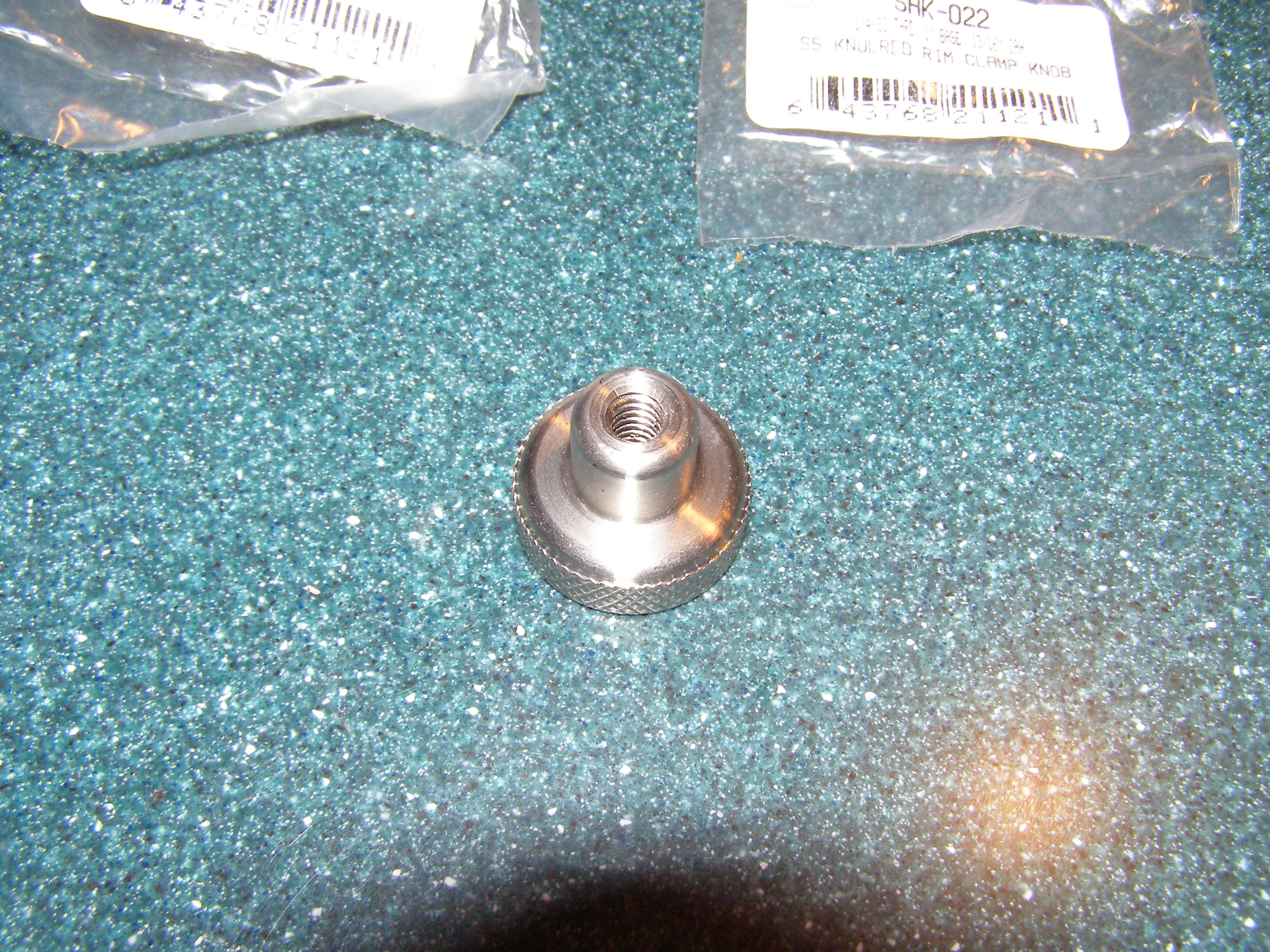 A view of the bottom end of the stainless steel knurled knobs. This end is tapped to receive a 1/4"-20 size threaded rod. The knob is 1"L x 1"W in size.