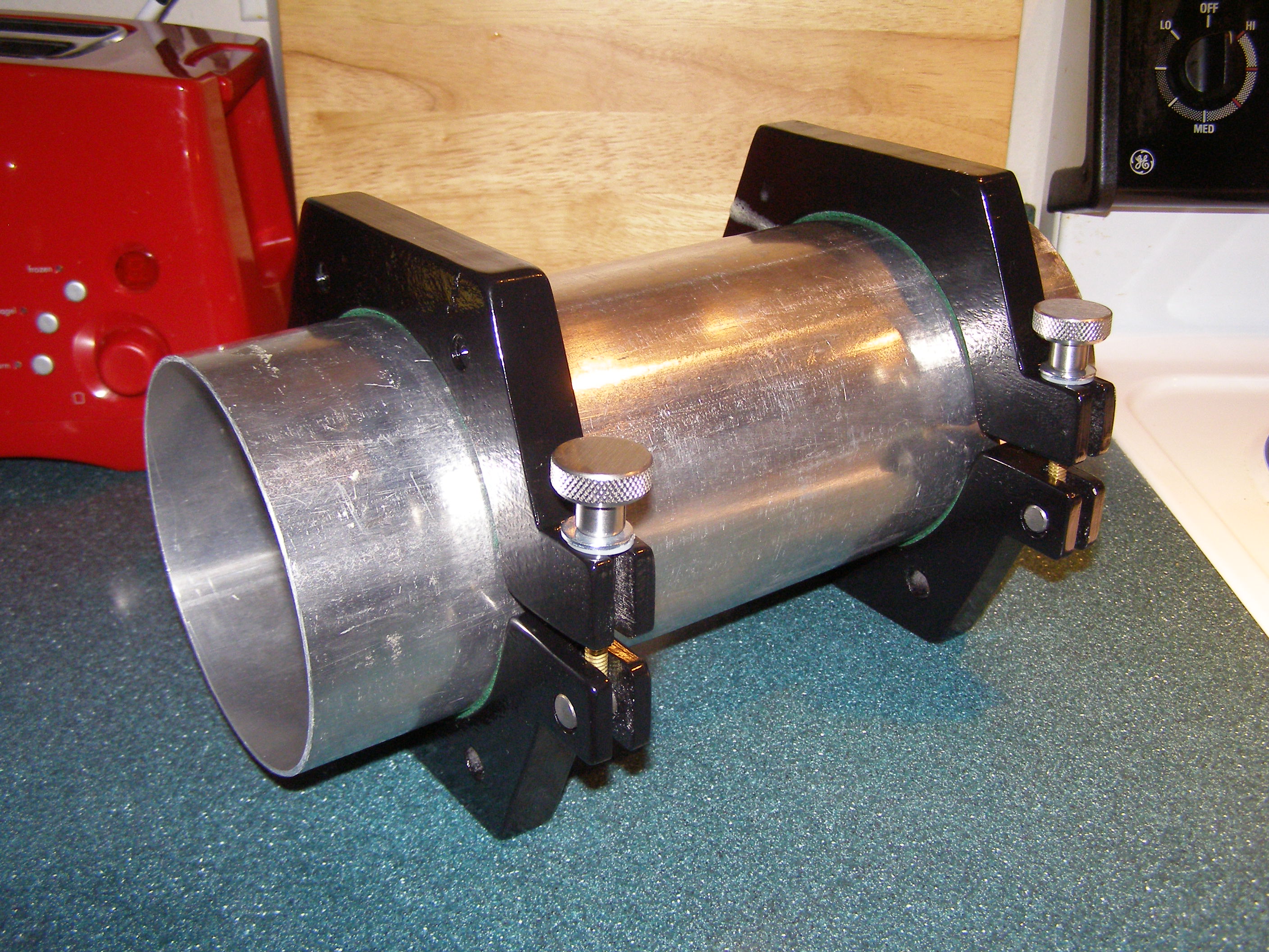 Wrapped around a remnant piece of 5" outside diameter aluminum tubing to perform a test fit, the newly completed cradle rings look and perform great! This view is of the knurled knob side, which locks the cradle rings around the OTA.