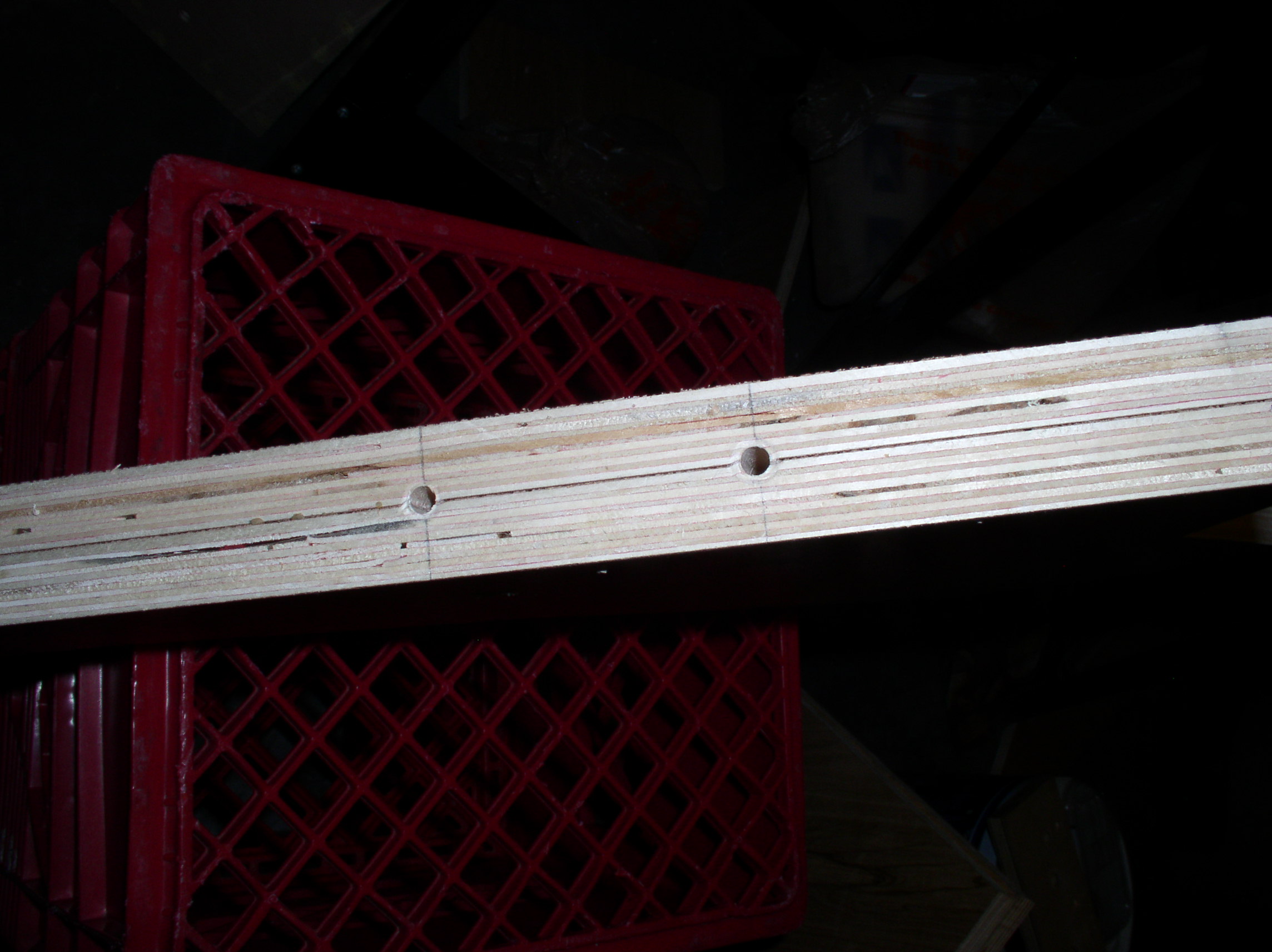 I know... I know... We have not showed you the drilling of the dowel-nut holes. But, their placement will be revealed shortly, or you check out the designs here. Here the 5/16" holes have been drilled in the bottom rear edge of the Truss Arms up to the perpendicularly drilled dowel-nut holes. Likewise, holes will be drilled in the Base Platform to accept the Truss Arms as well.